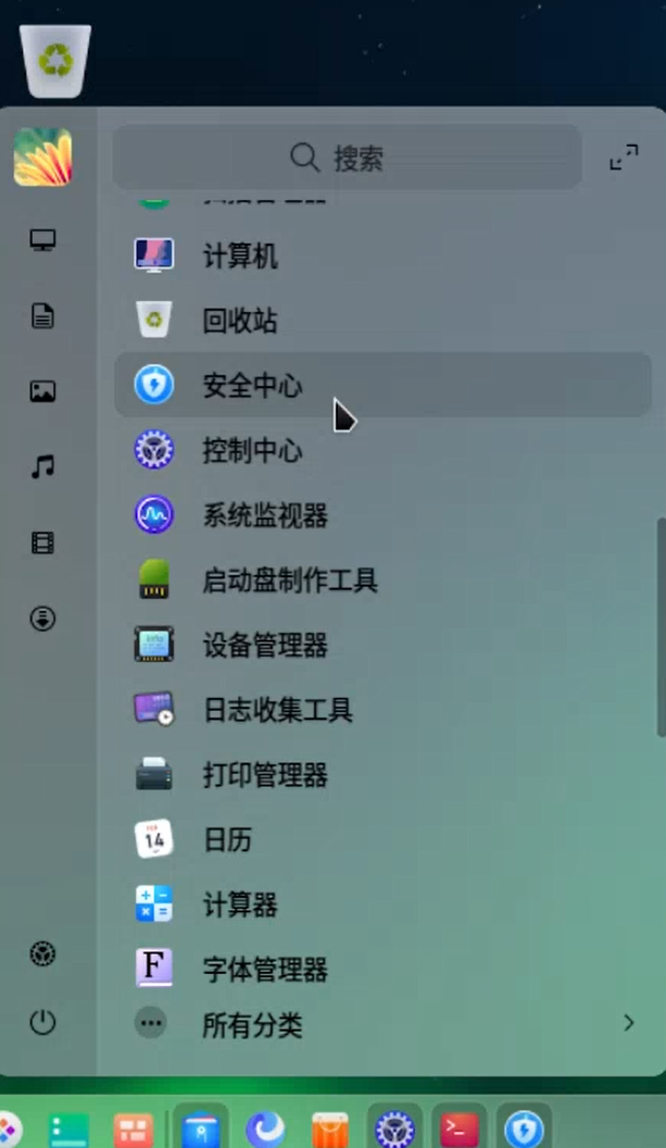 点击左下角的开始徽标按钮,找到“安全中心”。