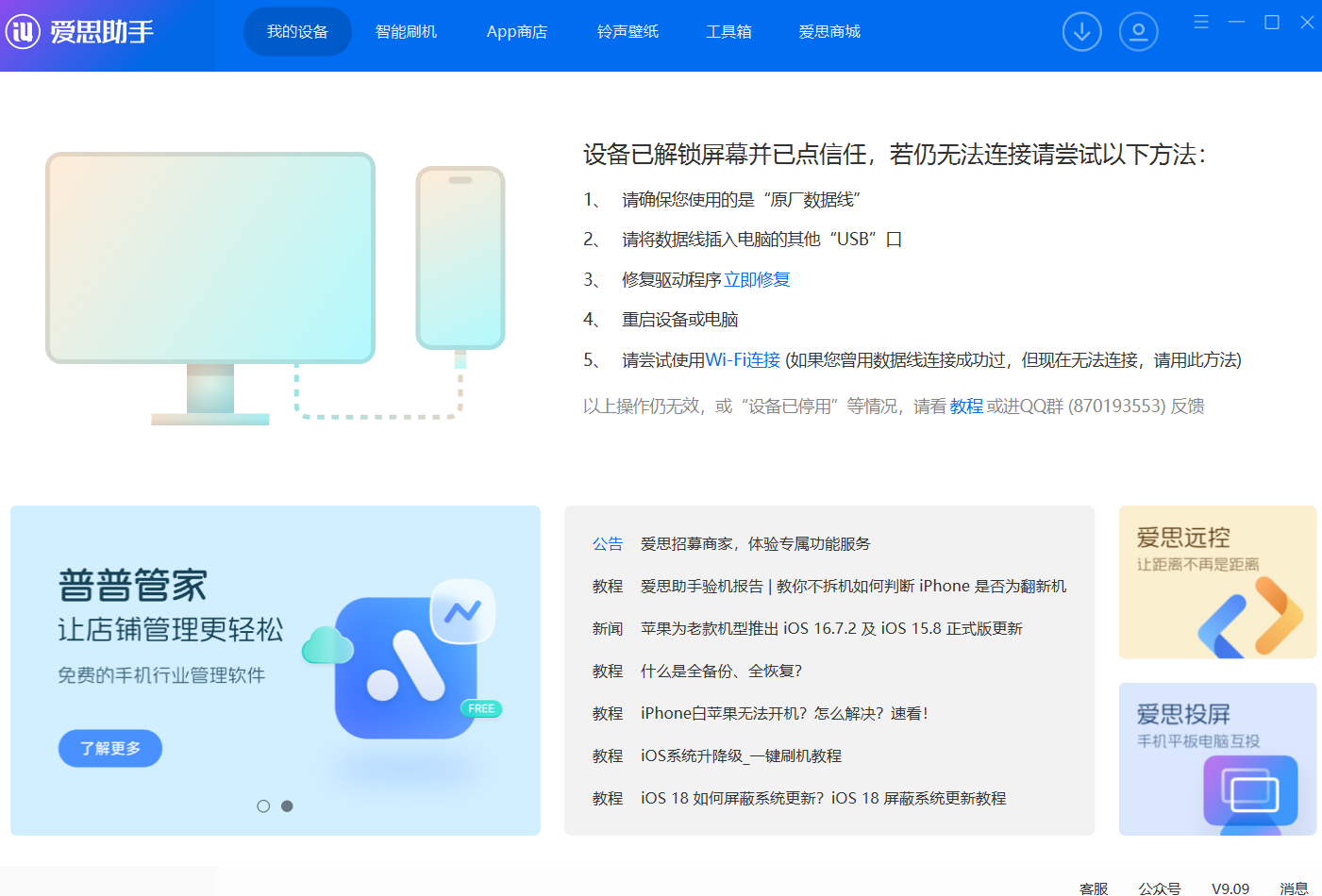 在您的额外电脑上安装爱思助手(一个移动设备的管理/维修/检验工具)并跟随指导安装所需驱动。您在完成后应看到如下界面: