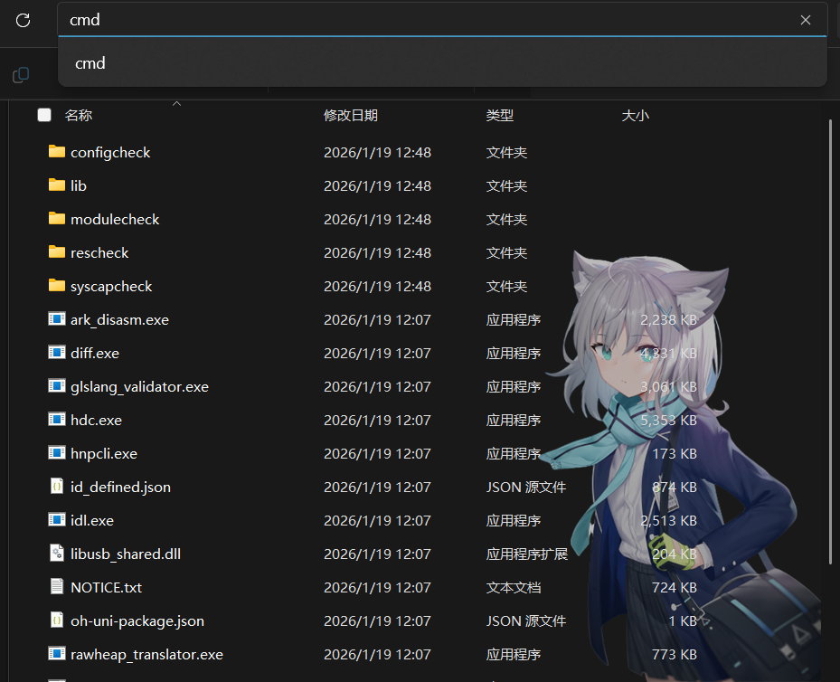 ~/DevEco Studio/sdk/default/openharmony/toolchains,并在地址栏中输入cmd。