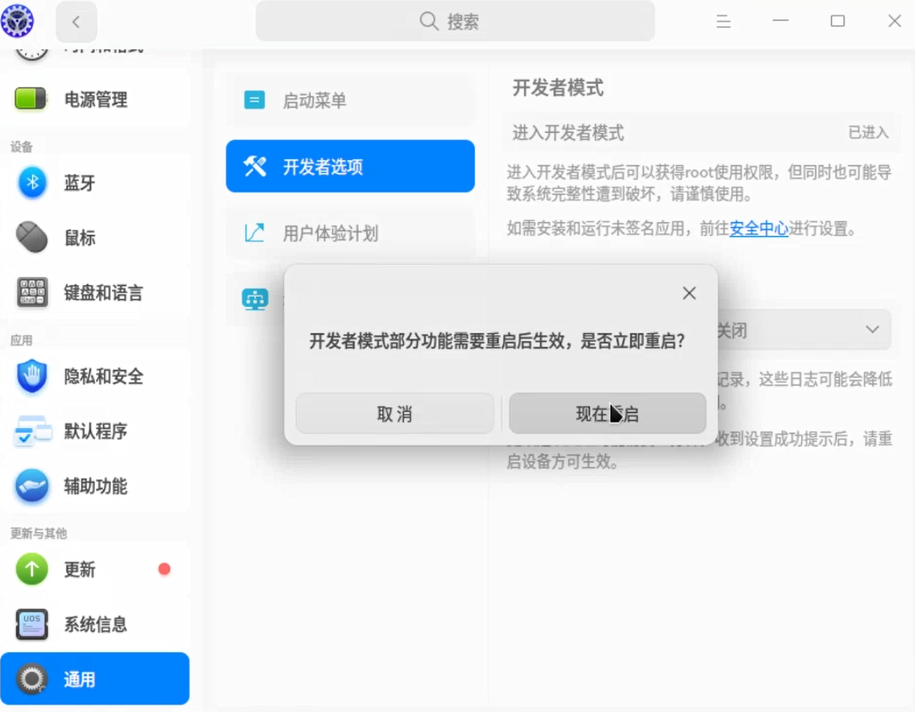 重启后重新进入设置-通用-开发者选项,若显示“已进入”则可以正常进行指南操作。