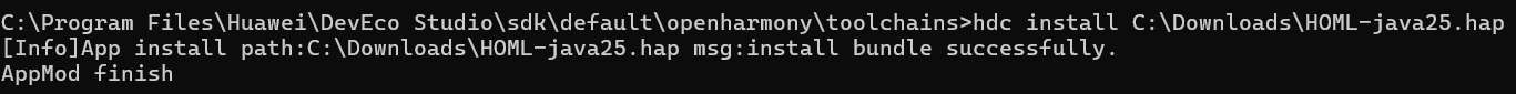 hdc install xxx.hap,其中xxx.hap是您下载的.hap文件名。显示类似如下输出即证明软件安装完成。
