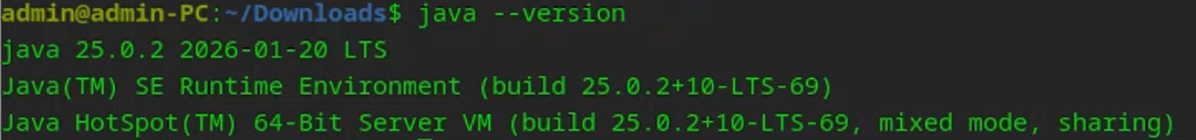 java --version确认java版本是否正确。目前本服务器推荐使用JDK 25。若您的命令行中出现如下输出即证明安装成功。